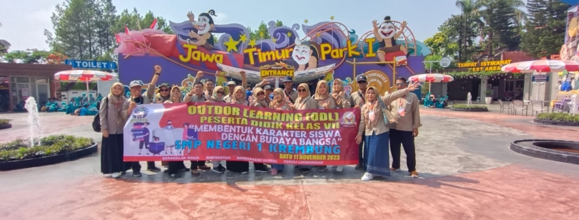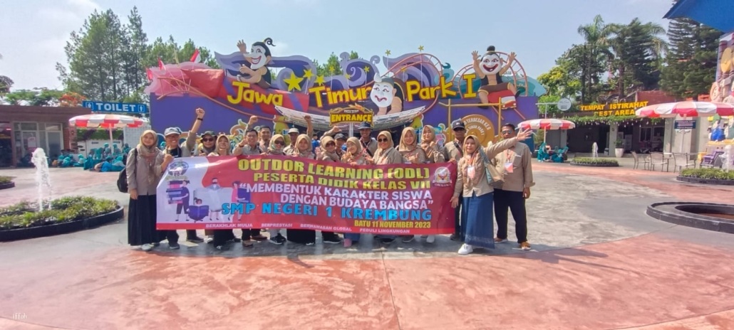 Krembung, 11 November 2023 – Siswa kelas 7 dari SMP Negeri 1 Krembung didampingi para guru mengadakan kegiatan Outdoor Learning (ODL) yang seru dan menyenangkan di Jatim Park 1. Pada hari Sabtu, mereka berkumpul di Wono Melatih dan segera mencari bus masing-masing. Setelah semua siswa sudah lengkap, bus pun berangkat. Selama perjalanan, mereka melakukan kegiatan pembiasaan dengan membaca yasin.